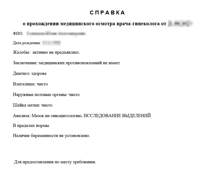 Выдается в свободной форме и содержит информацию о здоровье пациентки. Для получения этой справки не требуется обращаться в поликлинику именно по месту прописки – достаточно наличия на документе: