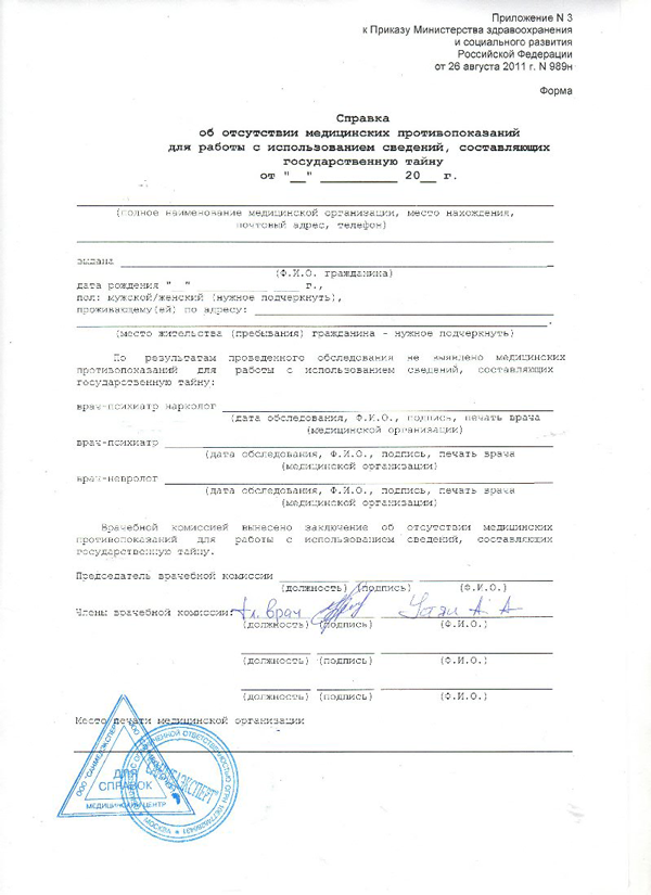 Медицинская справка по форме 989Н не столь распространена у нас, потому как она выдается только работникам определенной категории. Ее еще называют справкой для работы с гостайной и ее получают при прохождении медосмотра для трудоустройства в организации, которые имеют отношение в разведывательной, контрразведывательной, розыскной, внешнеполитической деятельности.