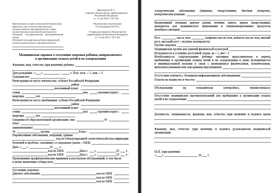 Справка для летнего лагеря заполняется на специально утвержденном бланке государственного образца № 079/у.
